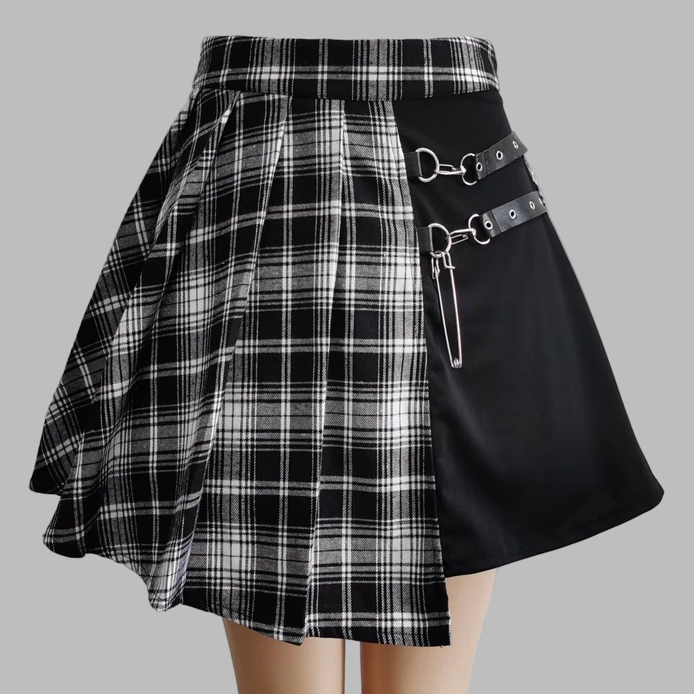 ブラック×ホワイト グランジパンクロック ベルト&スタッズ付きスカート