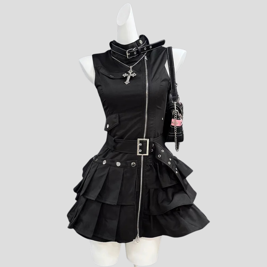 レディース黒ゴシックワンピース ストライプ ジッパー フリル付き