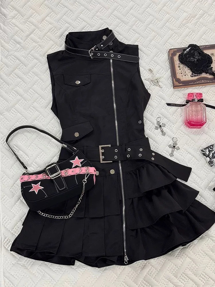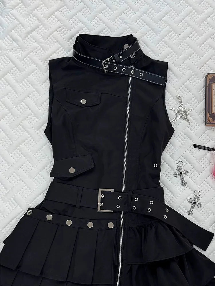 レディース ゴシック黒ワンピース ストライプ ジッパー フリル