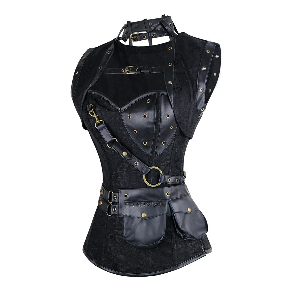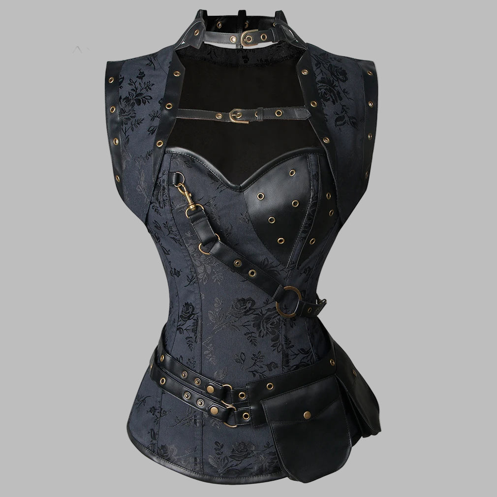 ゴシック・スチームパンク花柄レザー ベルト付きコルセット