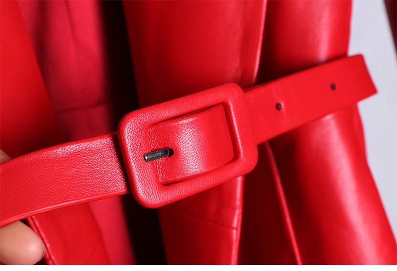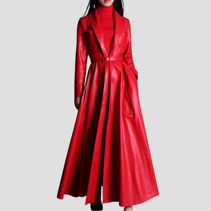 ロックスタイル レッド ロングレザーコート ベルト付き