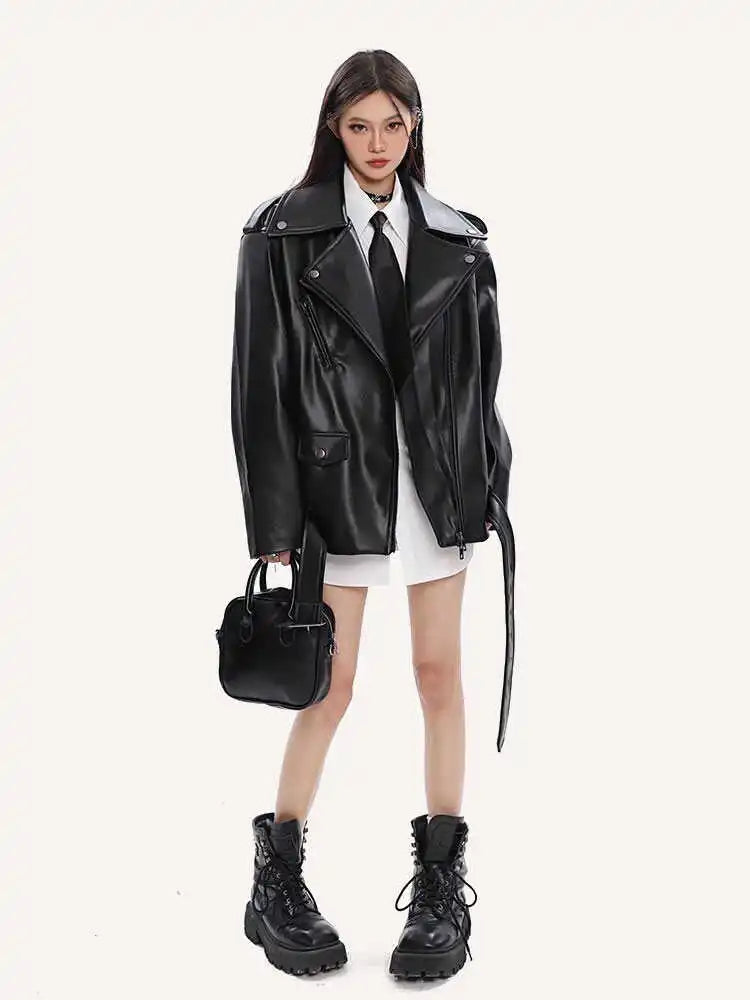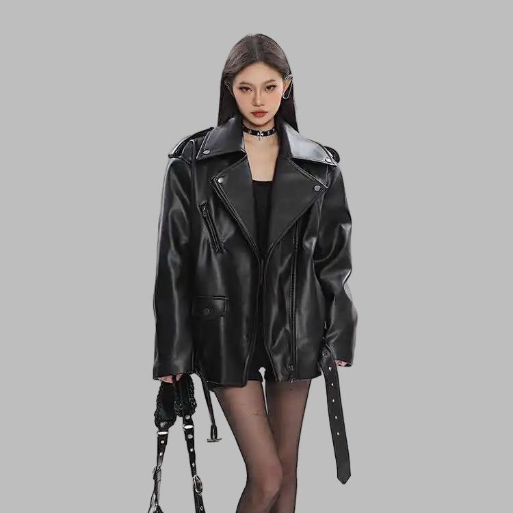 ヴィンテージ風ロングオーバーサイズ黒レザーゴシックジャケット レディース