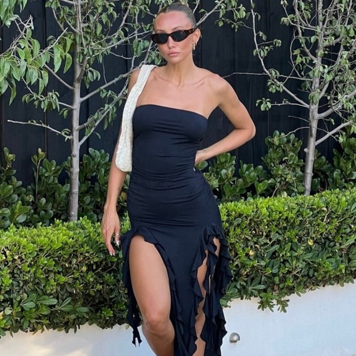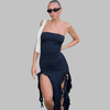 センシュアルなディテール: バストを包み込むデザインのストラップレスネックラインとフリルが、このワンピースに官能的で個性的なアクセントを添え、色気とエレガンスの調和のとれたバランスを生み出します。