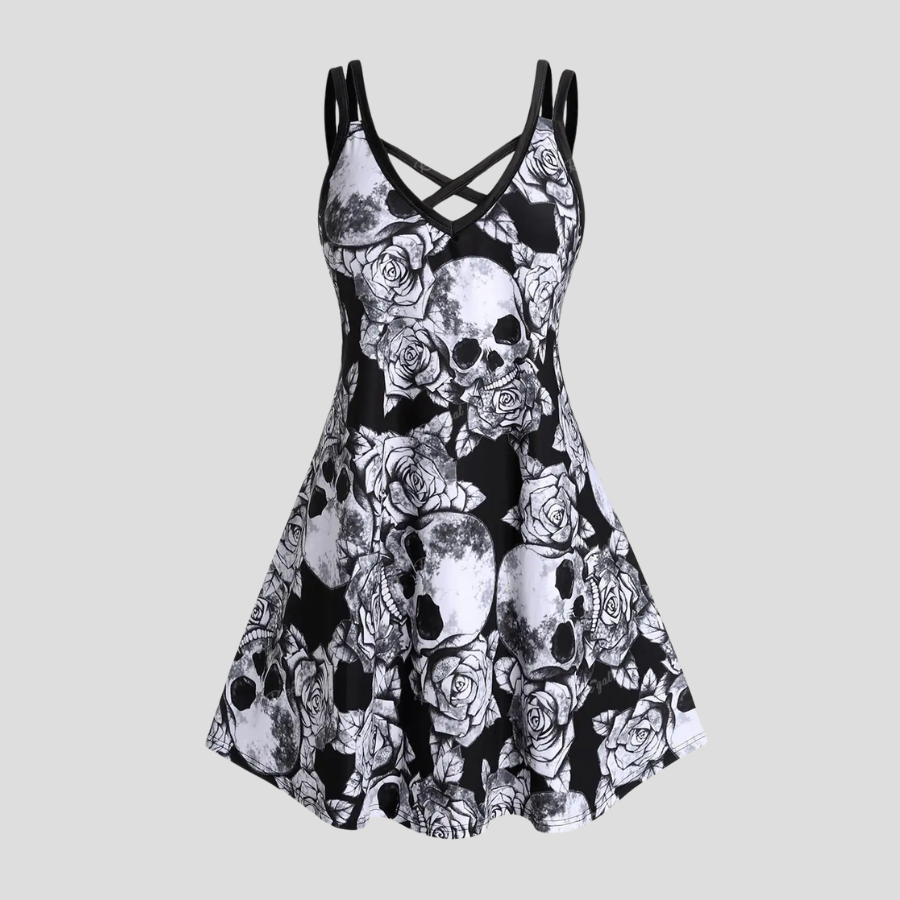 ホワイト ロックスタイル スカル&ローズ柄ワンピース メタル風